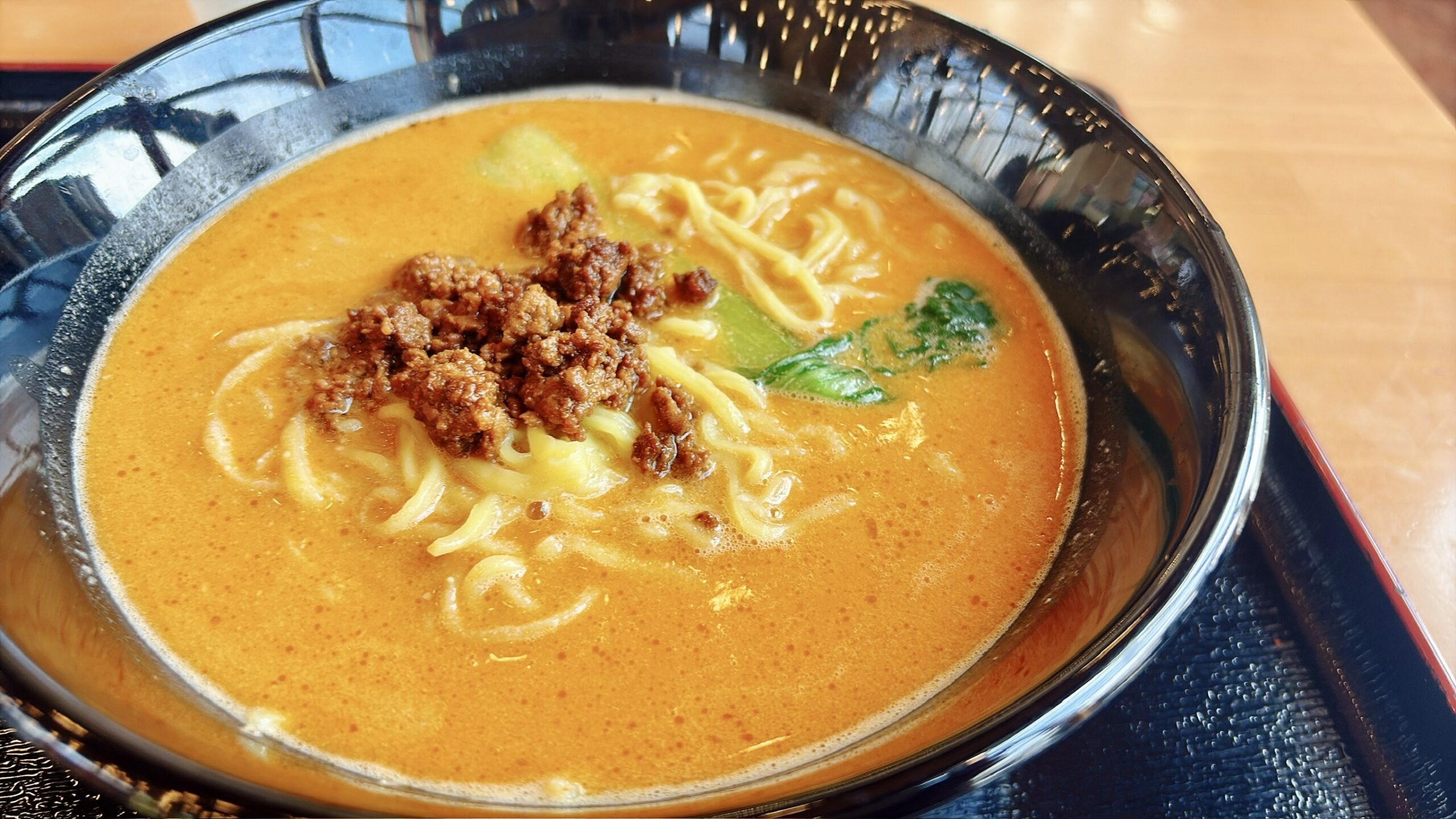 トッピングは炒めた挽き肉とチンゲン菜。特製味噌ダレの旨味がしっかり効いていて、寒い季節には特に染みる味です。
