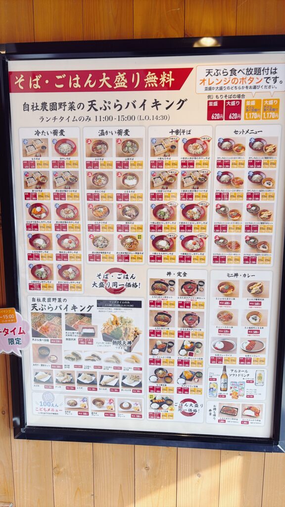 そば・ご飯、どちらも大盛り無料。さらにランチ限定の天ぷらバイキングまで……。