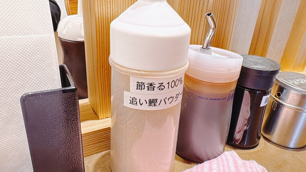 麺の量も多く、大盛りにしなくても十分満足できます。そしてここで卓上の追い鰹パウダーを投入。