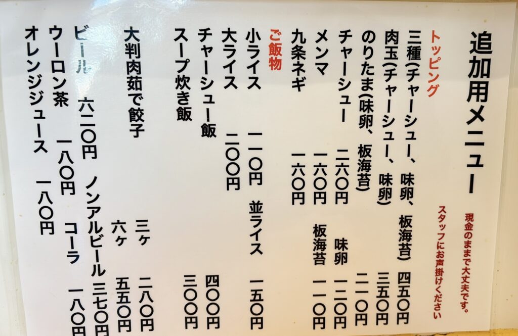 現金での単品注文が可能で、トッピングやライスも追加OK。