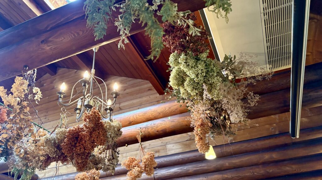 壁や天井にはドライフラワーがたくさん飾られています。