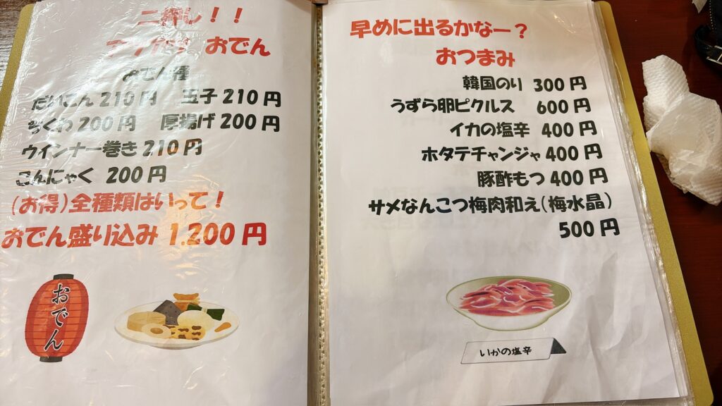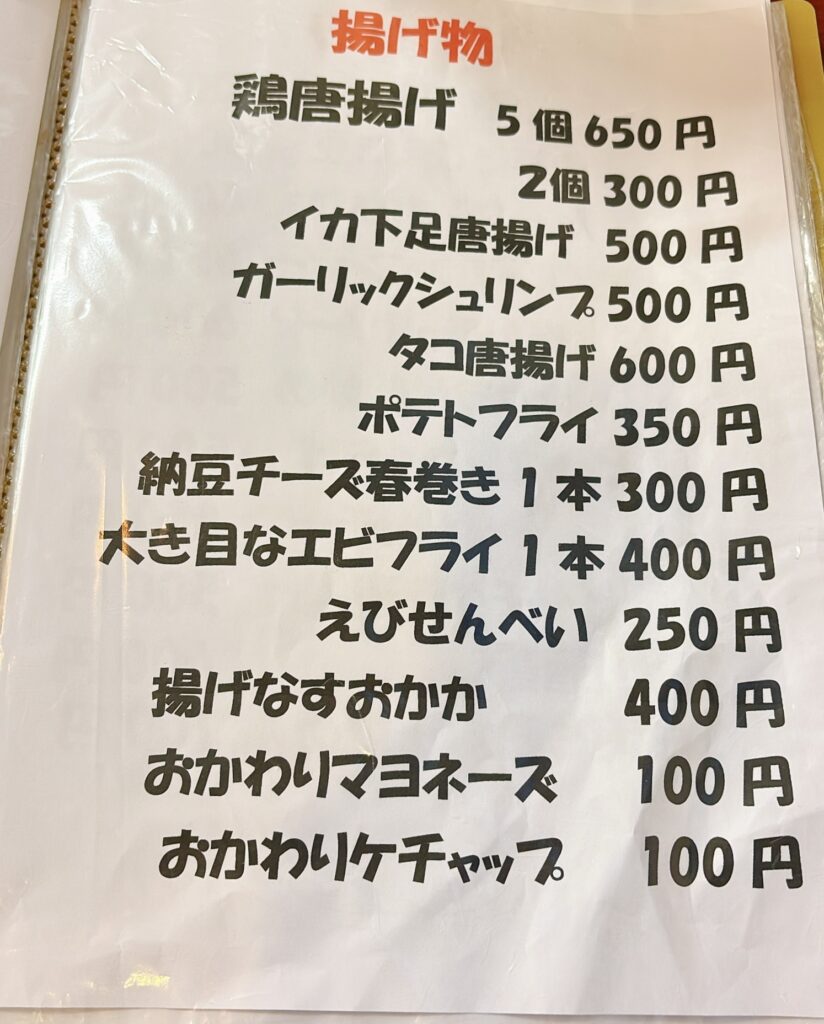 種類も多く、つまみ系からガッツリ系までしっかり揃っています。
