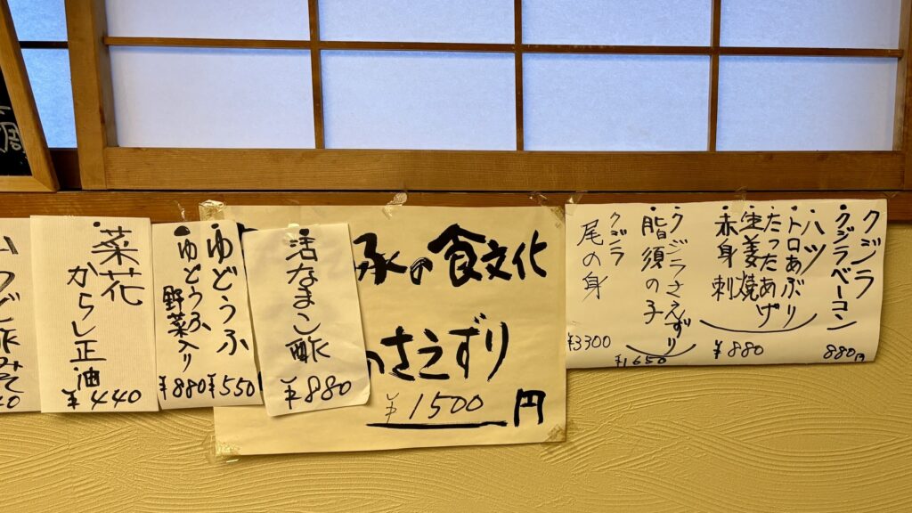 メニューは壁に貼られた短冊。海鮮中心で、どれも魅力的。