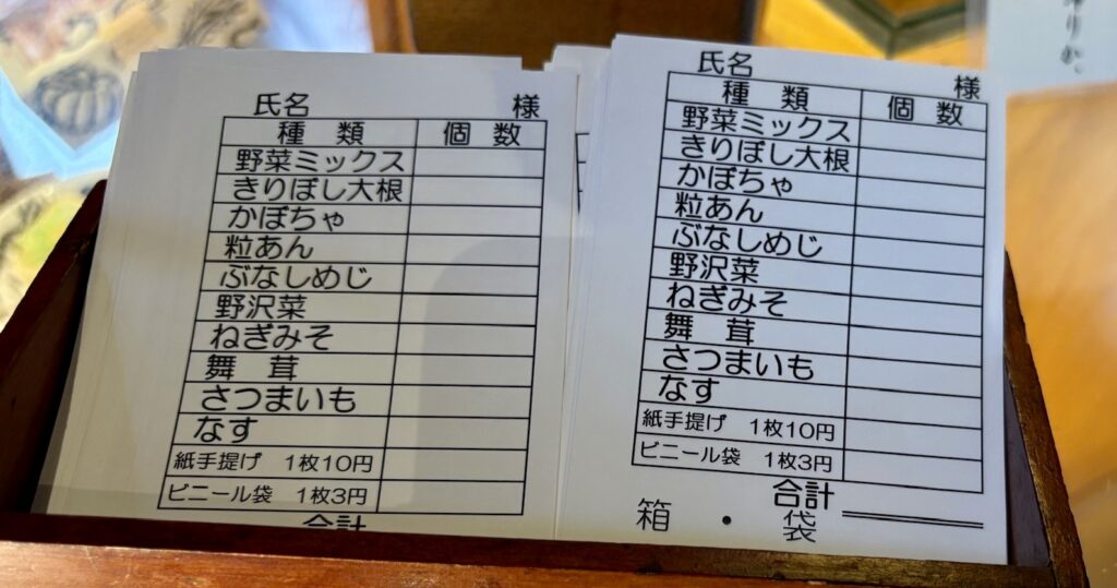 注文は記入方式で、店員さんの対応もとても丁寧です。イートインでは焼きたてのおやきを提供していただけます。