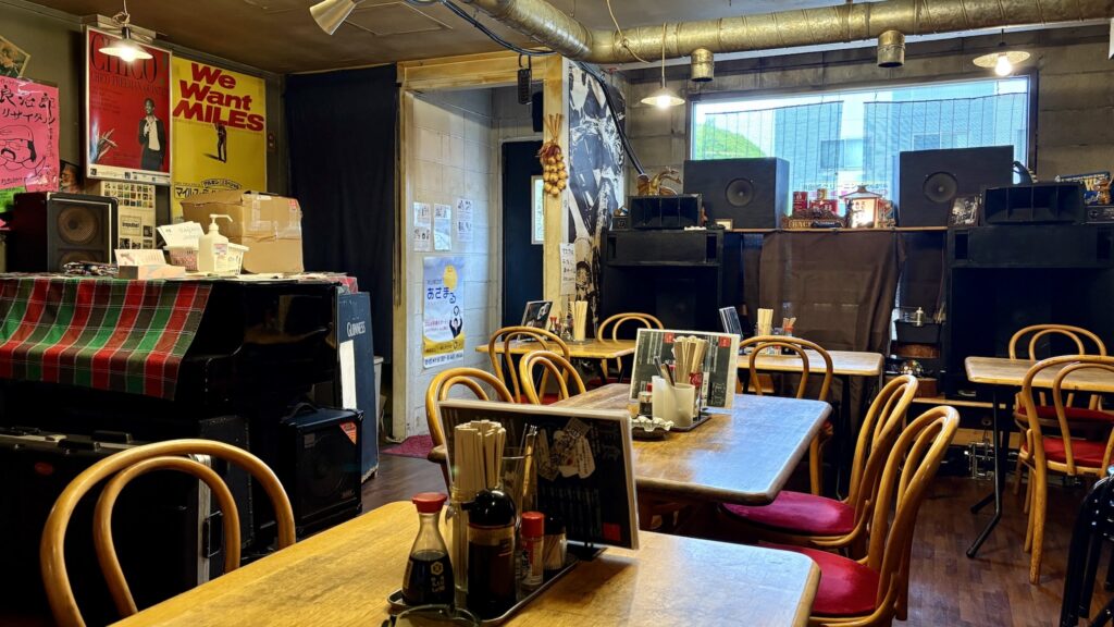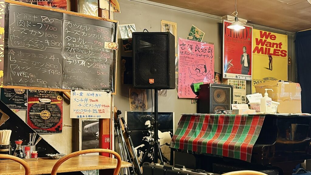 店内にはピアノや大きめのスピーカーが並び、壁にはポスターがびっしり。