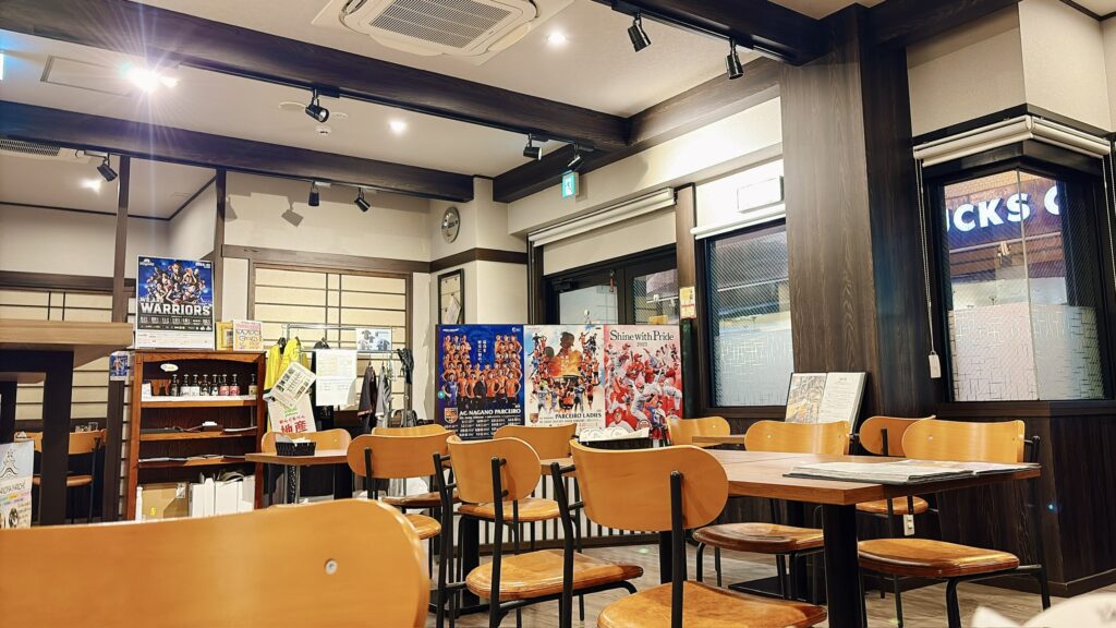 店内はテーブル席中心の落ち着いた空間。木のぬくもりと清潔感が心地よく、ひとりでも気軽にくつろげます。