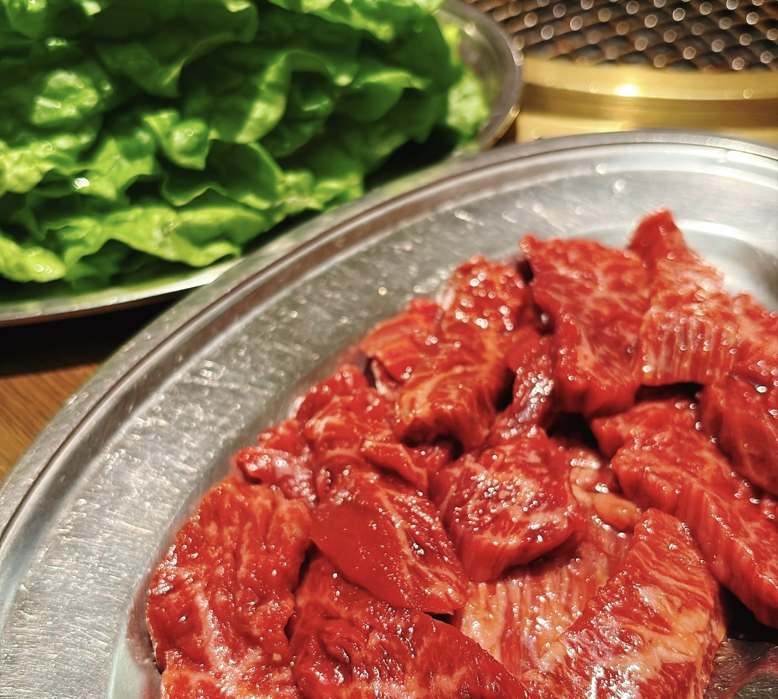 カルビは脂がしっかりのっていて濃厚な味わい。サンチュに包んで、キムチを少しのせていただくと、