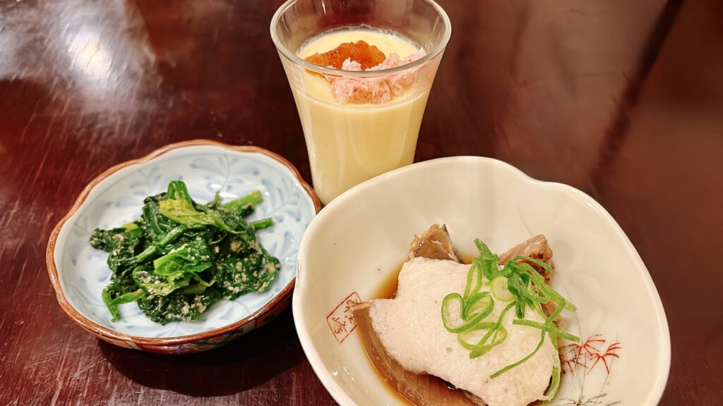 こちらは定番のお通しとのこと。どれもさっぱりとした味付けで、