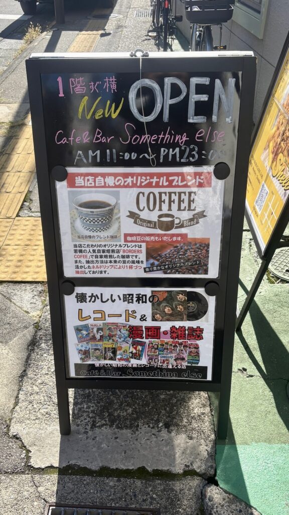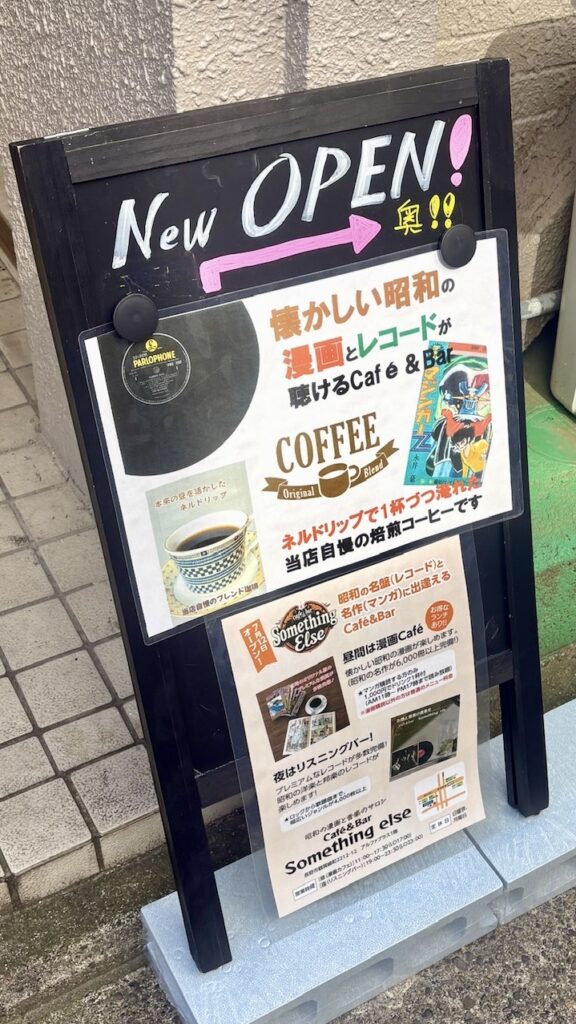 ふと目に留まったのは、昭和漫画とレコードが楽しめるカフェバーの看板。